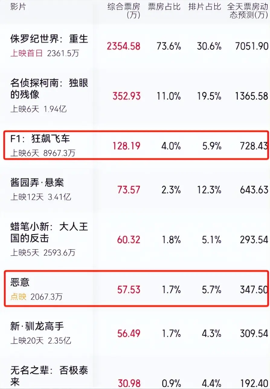 当然,如果只是用《恶意》与《F1:狂飙飞车》进行正面对比,当然不太公平。